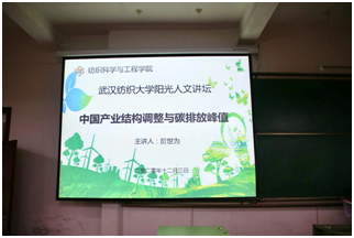 2020年12月3日下午,由校团委主办、纺织学院承办的第221期阳光人文讲坛在阳光校区崇真楼T101举行。本次讲坛邀请到了中国地质大学经济管理学院教授、博导、副院长於世为纺院师生带来了以“中国产业结构调整与碳排放峰值”为主题的讲坛。本次活动吸引了纺织、管理、环境等学院近200人参加。