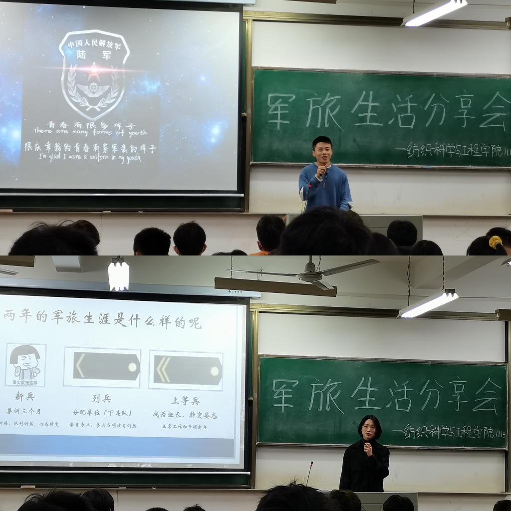 11月15日晚上6点,纺织学院在3栋教学楼03-115教室举行军旅生活报告会。本次报告会邀请了纺织学院纺织12001班张汶和纺织52003班游子吟为同学们分享他们的军旅生活。报告会由纺织实践部田浩然主持、辅导员严蔷薇、李亮、吴童玲及全体新生参加活动。
