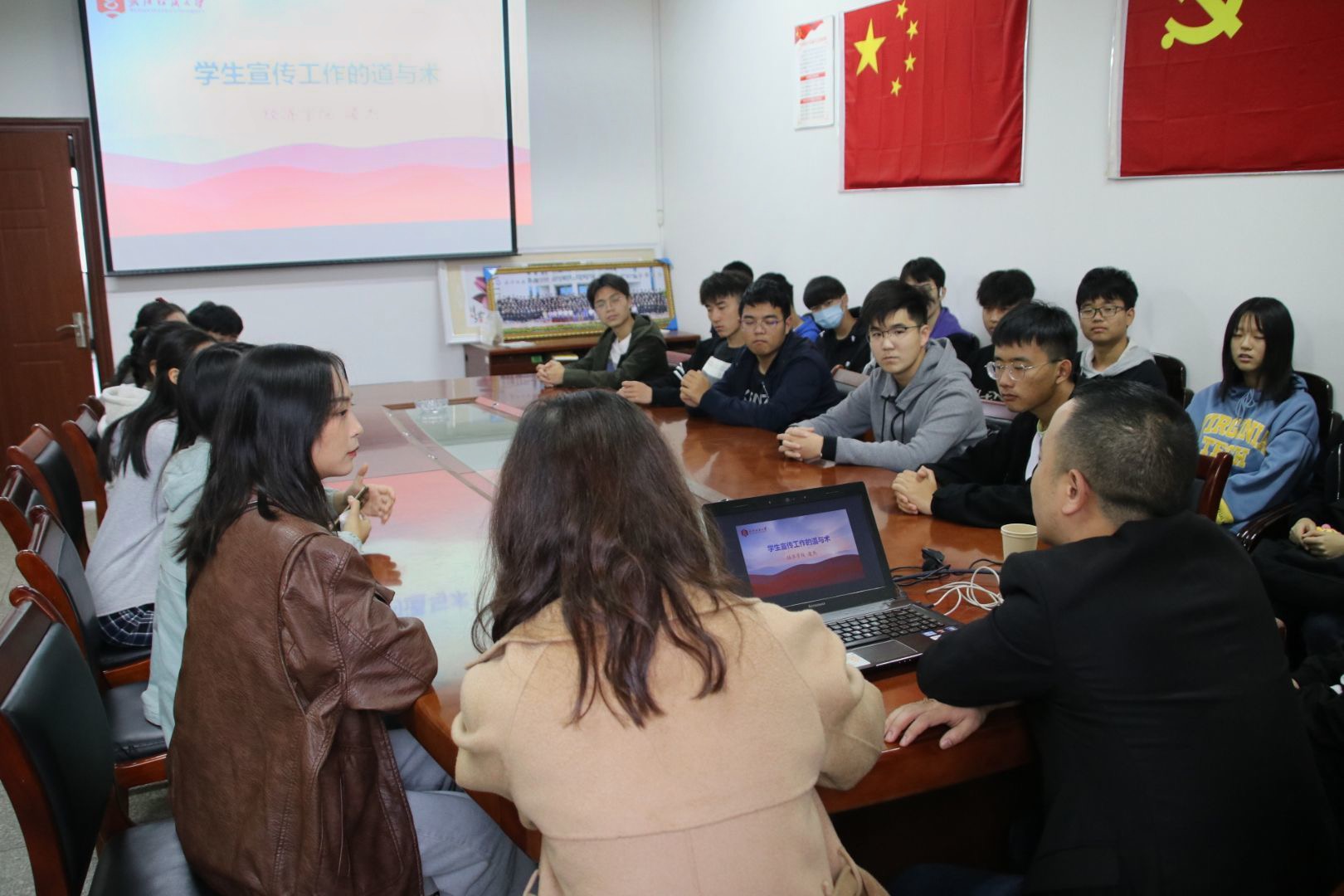 为加强学院宣传思想工作,提升学生宣传思想工作队伍能力素养。11月19日下午,纺织学院青年媒体中心于(写8号教学楼的别称)召开宣传思想工作队伍培训会。邀请经济学院辅导员凌杰老师作专题培训。会议由辅导员吴童玲老师主持,纺织学院青年媒体中心全体成员和各班宣传委员们参加了会议。