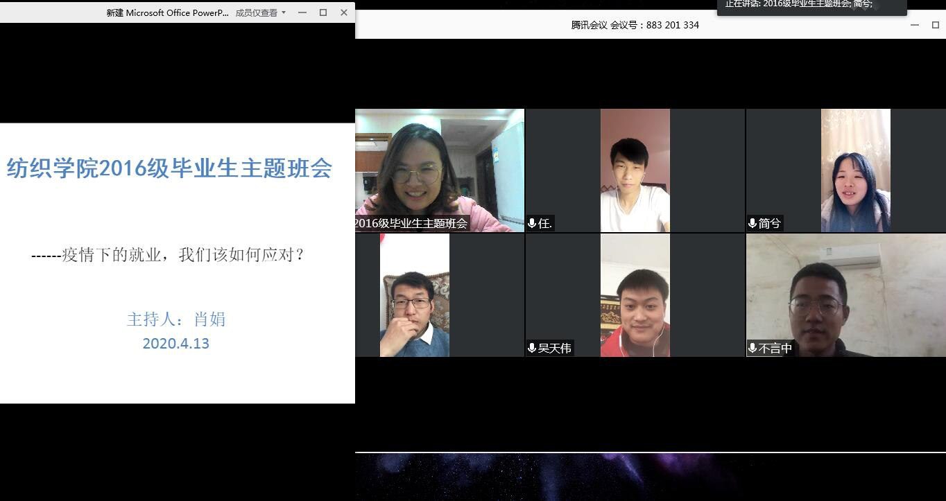 2020年4月13日,纺织学院召开了2016级毕业生网上主题班会,2016级部分毕业生参加了此次班会,班会由辅导员肖娟主持。
