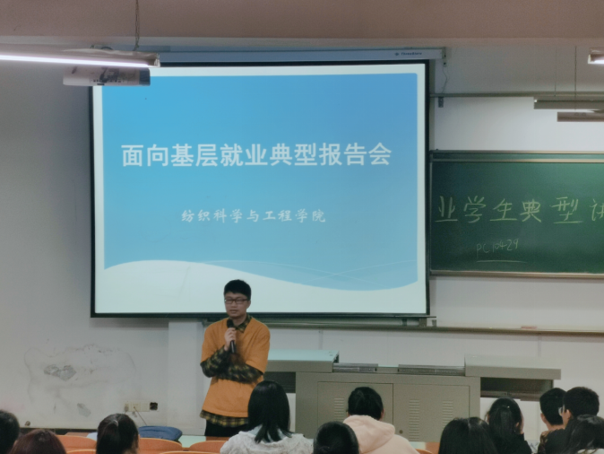 为了帮助同学们树立一个明确的发展目标,了解学生基层就业的具体情况,纺织学院于11月17日傍晚于8F-T101举行了面向基层就业学生典型讲座,严蔷薇,潘辰出席了本次会议,全体大三学生参加了本次会议。