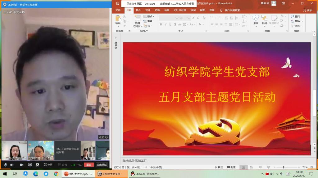 5月17日下午6点,纺织学院学生党支部组织开展了“激扬战‘疫’”为主题的支部党日活动,本次活动在学生党支部QQ群中以群连线视频的方式开展,纺织学院党委陈海副书记、三位本科生支部书记以及全体学生党员参与了本次云上会议。