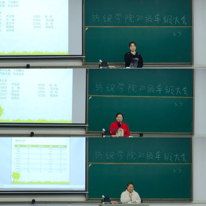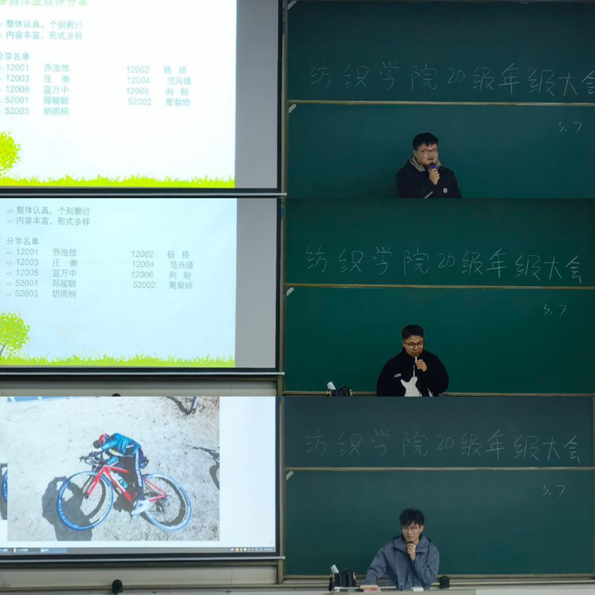 新学期开始,为对此次寒假生活进行总结,并帮助同学合理规划学习生活,3月7日晚上7点,纺织学院召开20级新学期年级大会,陈海副书记,纺织学院20级全体学生参加了此次会议。本次会议由吴童玲老师主持。