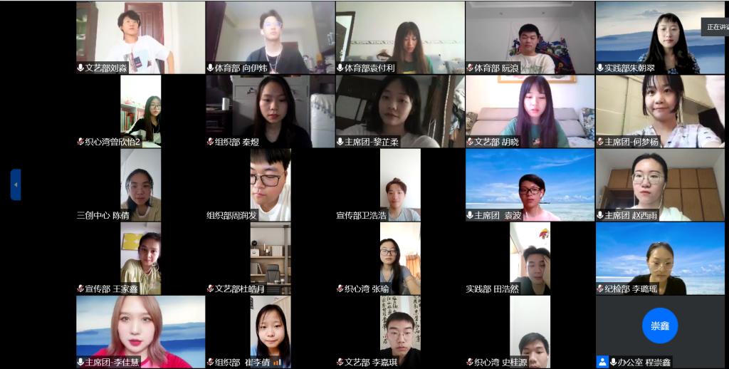 最后李亮对纺织学院学生会工作概况进行总结,并列举了学生会的各项成就,对大家进行赞扬鼓励,对学生会的未来作出展望,希望大家能不忘初心,砥砺前行,继续保持纺院学生会有爱的氛围,让学生工作的开展更上一层楼,一起和纺院向更远的未来迈进。会议尾声,纺院团委、学生会成员在主席的带领下进行线上合影。