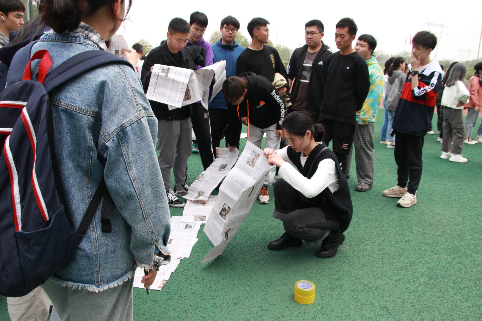 当日,阳光明媚,在年级辅导员的组织和带领下,全体20级学生和部分高年级同学在操场集合,随即开始了游戏环节。游戏名为“无敌风火轮”,重在培养班级同学的团队协作能力。游戏开始,纺院各班长就充分发挥出其领导能力——分发道具、安排分工……各项准备有条不紊地进行。最后,在所有同学的努力下,象征着各班集体的“风火轮’在跑道上稳稳前进,先后安全抵达终点。