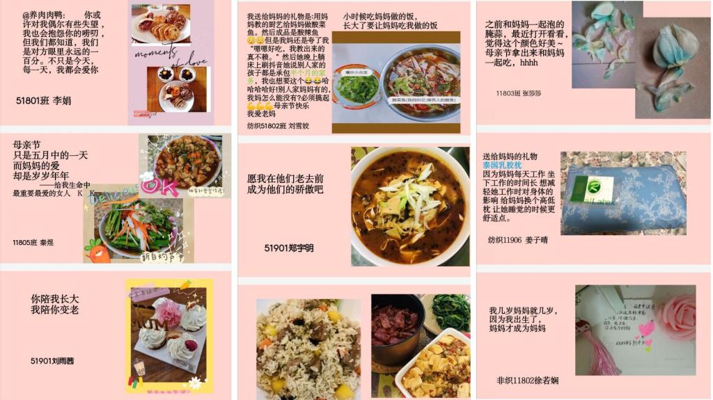 本次活动采用线上征集的形式进行,纺院学子们将对母亲浓浓的爱意以图片辅以文字或视频的形式发送给活动负责人,并由宿管会对征集作品进行评选,评出优秀作品进行展示。同学们在此过程中表露自己对母亲的爱意,以为母亲做饭、与母亲一同出游、送母亲礼物等丰富多样的形式展现了自己对母亲的爱。本次活动作品在学院公众号推送展示,受到了纺院学子的一致好评。