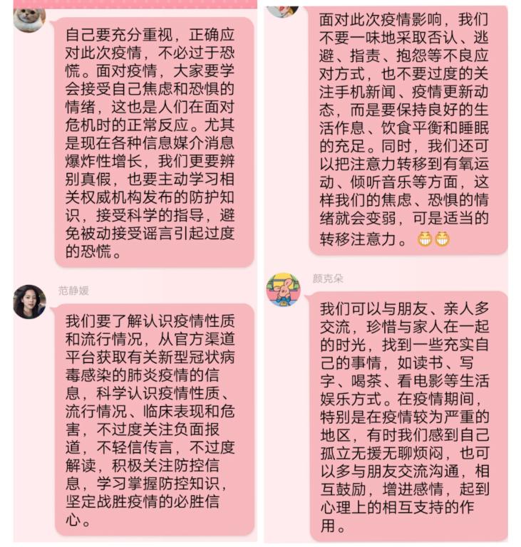为进一步做好疫情防控工作正面宣传引导,关注疫情期间同学心理健康问题,纺织学院于2020年3月25日12:40以班级为单位开展了“共战疫情,同温心灵”325主题班会。