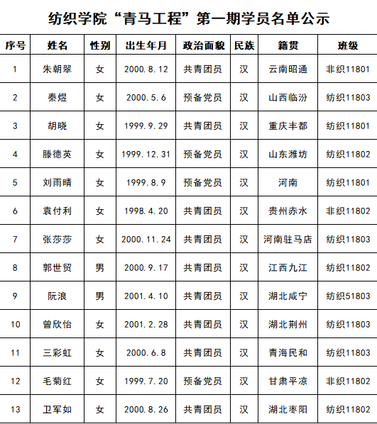 纺织学院“青马工程”第一期学员名单公示