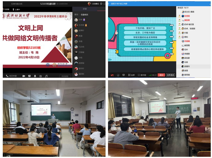 为进一步引导大学生树立文明上网的意识,营造健康和谐的网络舆论环境,筑牢疫情防控坚实防线,共建风清气正的网络文化空间。纺织学院各班团于4月10日晚召开“文明上网,共做网络文明传播者”、“牢记公民责任义务,共筑疫情防护屏障”主题班会。全院班主任、辅导员、在校生通过线上线下的方式共同参与。