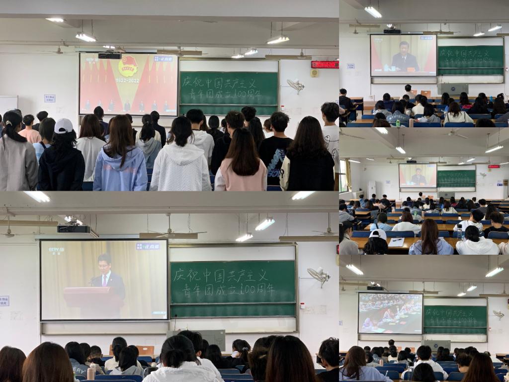 5月10日上午10时,庆祝中国共产主义青年团成立100周年大会在北京人民大会堂隆重举行。纺织学院团委组织全体学生线上线下同步观看庆祝中国共青团成立100周年大会,学习习近平总书记在会上发表的重要讲话,共同回顾中国青年百年历程,领会新时代青年精神,了解青年肩负的时代责任,认清青年发展目标。
