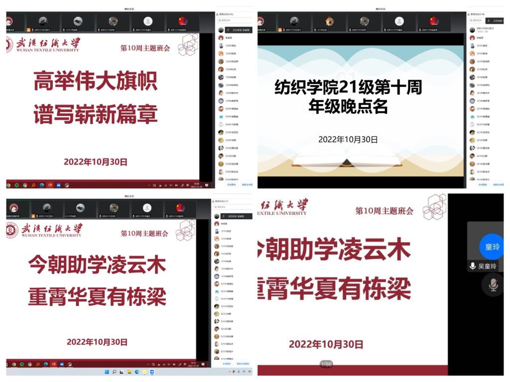 一代人有一代人的使命,一代人有一代人的担当。为了进一步宣传、学习和贯彻党的二十大精神,增强同学们对党的二十大精神的理解和认知,纺织学院于10月30日下午在线上开展“高举伟大旗帜,谱写崭新篇章”主题班会,此次班会由学院党委副书记、各年级辅导员及各班班主任共同参与。