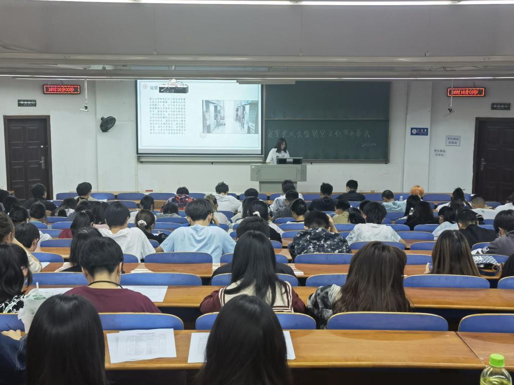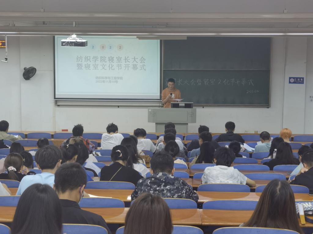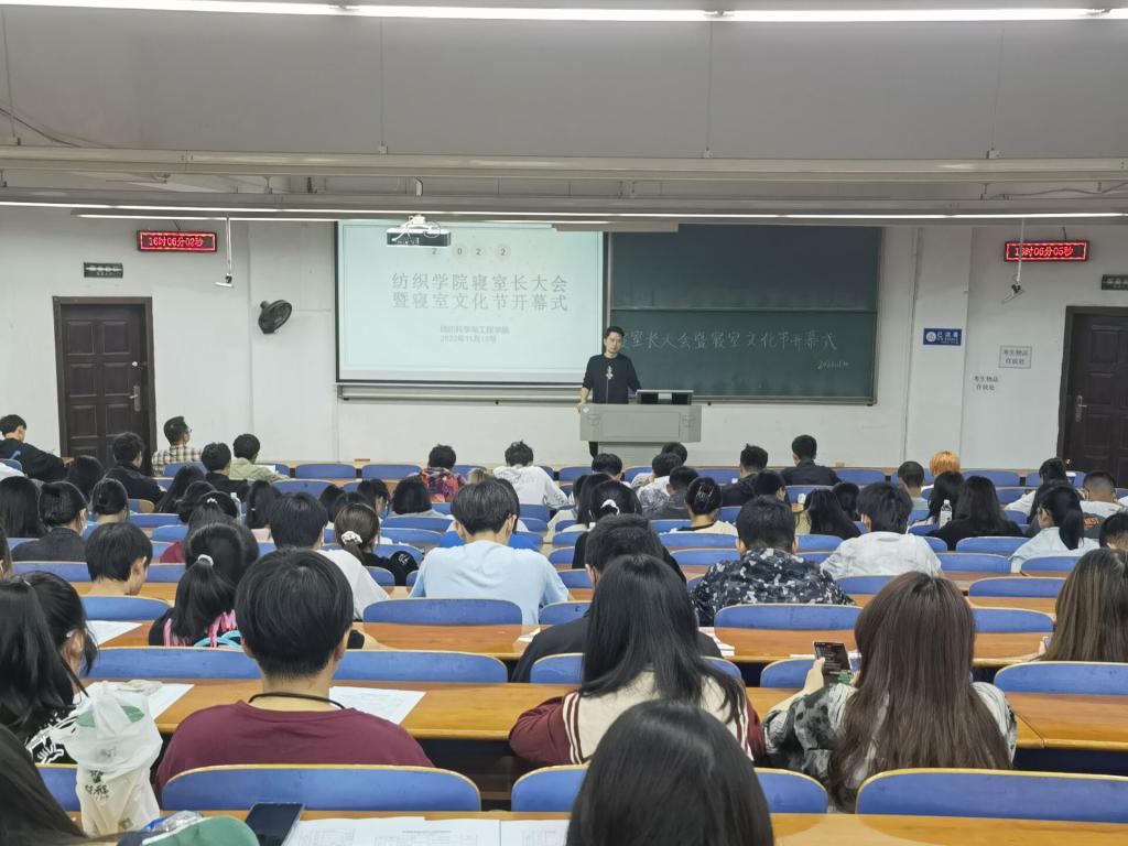 学生寝室文化建设,促进学生之间的深入交流,丰富学生的校园生活。纺织学院于11月10日在03- T102 开展了“寝室长大会暨寝室文化节开幕式”。本次大会由纺织学院党委副书记李亮、团委书记梁祥云、22 级辅导员王然和各寝室长共同参与。
