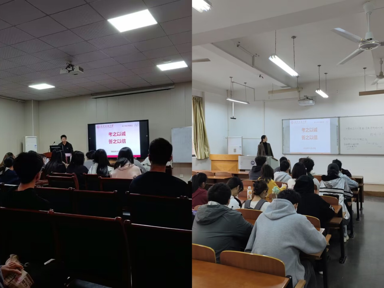 纺织学院始终高度重视学生的考风考纪教育,坚持严抓考风考纪,以考风促学风。为整治考试作弊,培养良好学风,落实立德树人根本任务,提高大学生“以诚立身、以信致远”的良好品质,于11月20日在3栋教学楼集中召开了 “考之以诚、答之以信”的考风考纪主题教育。