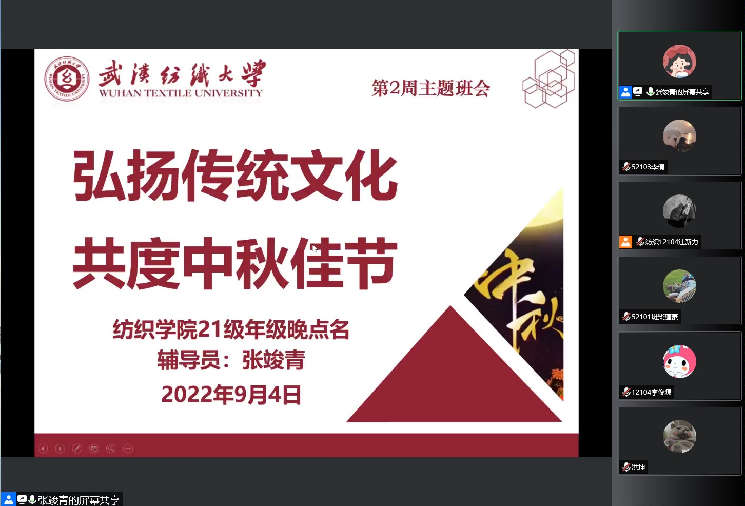 为帮助学生尽快适应学校生活,增强学生安全意识、提高其思想认识,积极配合学校疫情管控要求。9月4日,肉视频 21级召开线上新学期年级大会,会议由辅导员张竣青主持,全体21级同学共同参与。