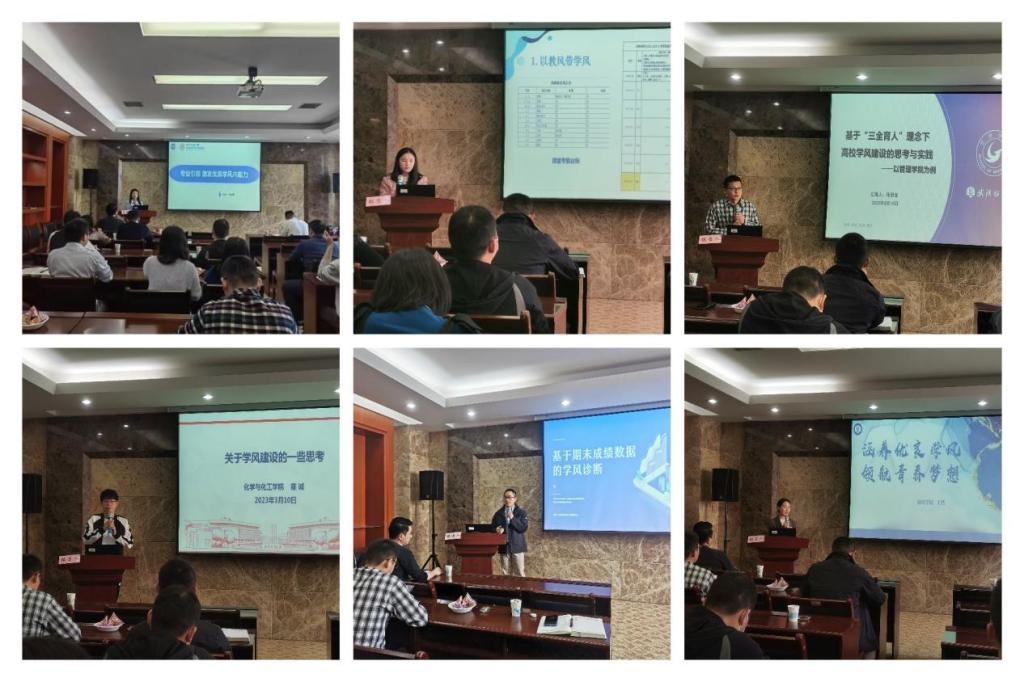 活动中,六位辅导员老师围绕“优化学风建设体系,促进学生全面发展”主题,结合所在学院专业特色和各年级不同情况的工作实践经验展开交流。纺织学院张竣青老师以《专业引领 激发优良学风内驱力》为题,对学生出现的学业问题成因进行分析,总结提出要四位一体,用好学风制度、开展纺织文化宣传、投身科学实践锻炼、用活网络育人平台,引导学生树立专业自信心,激发优良学风内生动力;材料学院王鑫老师以《协同发力 共绘学风建设“同心圆”》为题,将学风内涵进行分析,分享其以教风带学风、严管理督学风、重辅导促学风、立榜样树学风的工作经验;管理学院张朋龙老师以《基于“三全育人”理念下高校学风建设的思考与实践》为题,介绍了管理学院学风建设具体实践路径;化工学院雍诚老师以《关于学风建设的一些思考》为题,分析年级期末考试数据及其背后的内外成因,提出要在思想、管理、环境、制度等层面严抓学风;环境学院郁星老师以《基于期末成绩数据的学风诊断》为题,分析本年级挂科数据情况,针对基础学科挂科率高、男生成绩普遍不如女生等具体问题提出针对性对策;纺织学院王然老师以《涵养优良学风 领航青春梦想》为题,通过对大学和高中凤的差异化分析,提出要依托一站式学生社区夯实学风建设,积极践行“一线规则”、坚持师生共处为导向、以培根铸魂为目标,以党风带教风端学风。