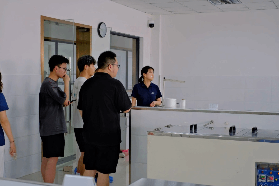 在公司相关负责人的带领下,实践队首先参观了公司的研发中心。据负责人介绍,这里的研发室主要负责测试检验,包括检验采购回来的纱筒以及测试已经加工好的成品。在参观过程中,实践队成员们了解到了许多专业知识,例如织品类别,纺织品的物理化学检验,检验的项目包括纱支、密度、克重、色牢度、抗起毛起球性等等。研发中心干净整洁的环境,精密的测试设备以及认真工作的员工都给成员们留下了深刻的印象,是同学们初步了解公司生产中的重要一环。