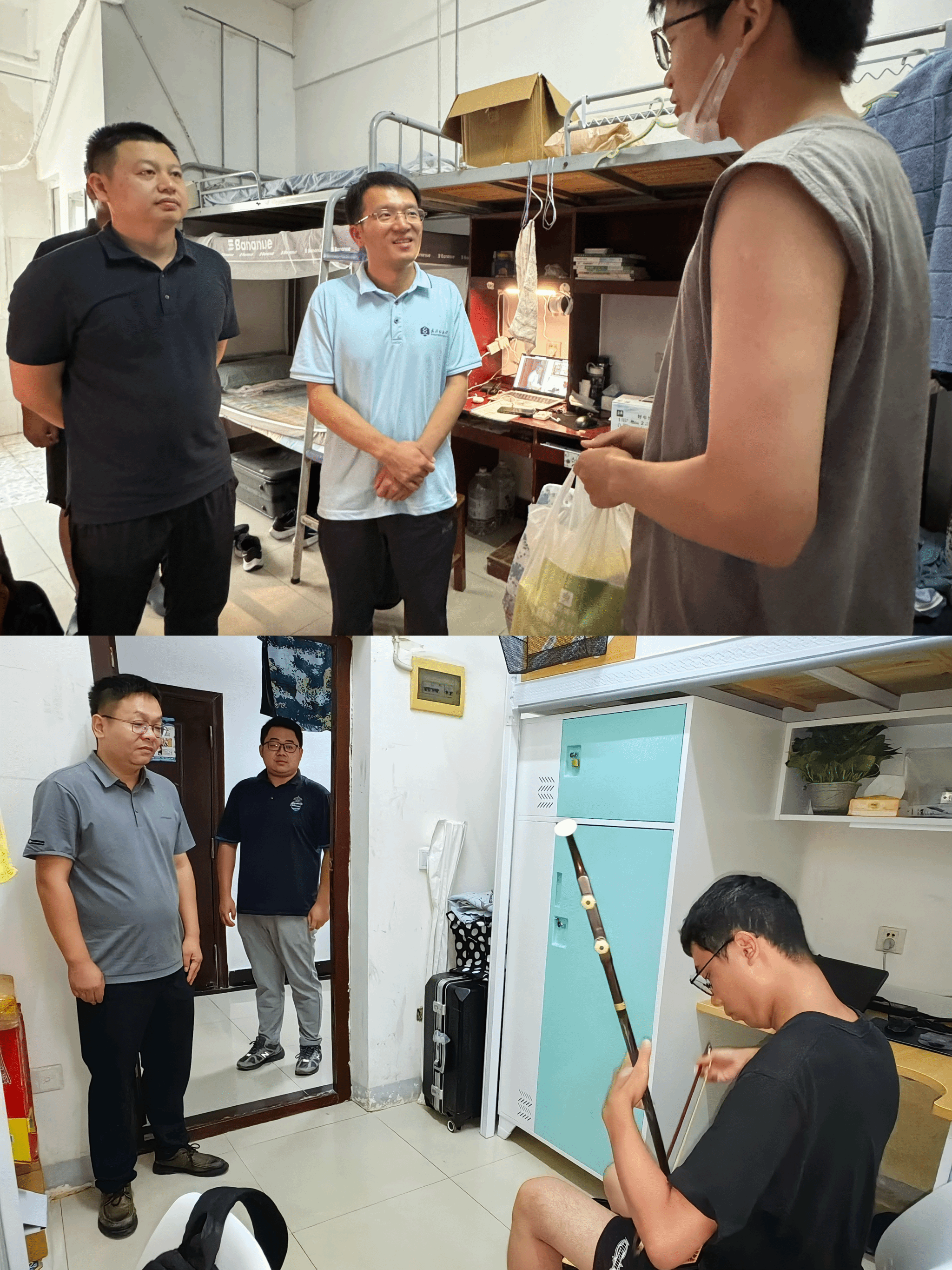 在走访宿舍的过程中,老师们和同学们进行了亲切的交流,了解同学们来校后的感受、对学校的印象等,朱张军看望慰问了军训期间带伤坚持训练的纺织12407班的陈舒岩同学,并勉励同学们“大学教给同学们的第一课是‘适应’和‘转变’,学校为大家提供了全面展示自己的舞台,同学们要挖掘、培养自己各方面的能力。”蔡光明为军训优秀学员纺织12404班高小源同学送去了学院慰问品并送去了学院的关心和问候,高小源同学还即兴向老师们展示了自己二胡才艺,蔡光明鼓励同学们学习之余多参加校园活动,培养个人兴趣爱好,充盈精神世界。