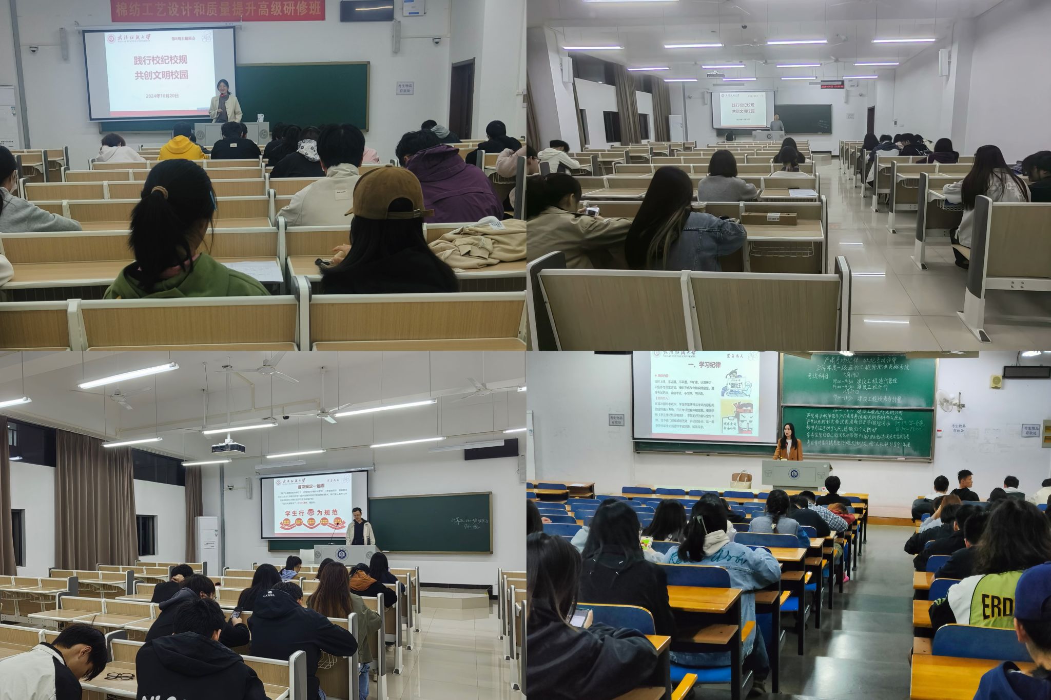 为了让学生深入了解校纪校规的内容和重要性,引导学生自觉遵守校纪校规,养成良好的行为习惯,纺织学院于10月20日开展“践行校规校纪,共创文明校园”主题班会。本次班会由各年级辅导员、班主任主持,全体学生共同参与。