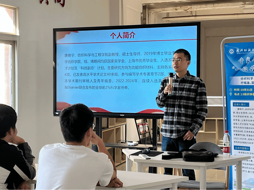 为深入学习贯彻党的二十大精神,大力弘扬科学家精神、涵养优良学风,充分发挥“一站式”社区育人功能实效。10月31日下午,纺织学院邀请2024年度全球前2%顶尖科学家唐晓宁博士深入13栋“织争朝夕”一站式学生社区与学生们开展“面对面”座谈会。纺织学院辅导员及各年级学生代表参加讲座。