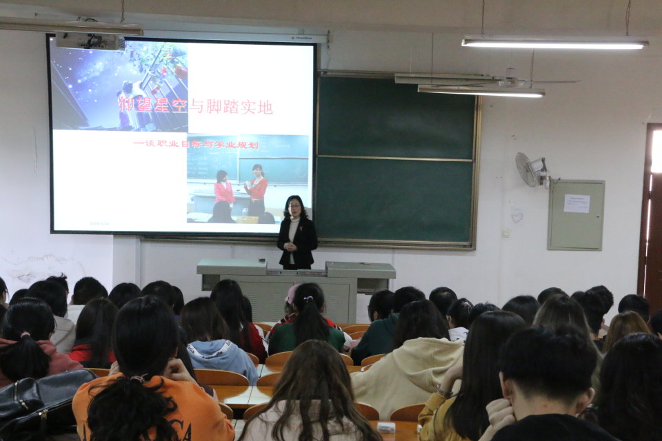 讲座伊始,余桂兰老师向同学们交流了有关自己对未来规划的想法,借此提出同学们要明确自己对未来的目标。随后,余老师从“漫说仰望星空与脚踏实地”、“浅谈如何明确职业目标”和“详解如何实现职业目标”三大方面向同学们阐述人生规划的必要性,并通过个人SWOT分析和能力ASK模型为同学们讲述了如何确定目标并实现目标的方法。余老师还着重为同学们介绍了曼切斯特大学,讲解了留学前应准备的事项并提出相关建议。随后,龚小舟老师上台发言,为同学们讲述了曼切斯特大学的校园生活和在外国留学所需要注意的事项,并鼓励同学们争取国外留学的机会