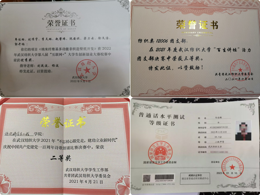 凭着“要做就做到最好”的干劲儿,勤奋好学的她,平均学分绩点3.63,自进校以来,她一直严格要求自己,未曾松懈,有着明确的学习目标,认真钻研专业知识,做到学一科、爱一科。她一直坚持“今日事,今日毕”的原则,脚踏实地,不做投机取巧的事。念念不忘,必有回响。具备了扎实的理论基础后,2022年她作为负责人主持的《纳米纤维基多功能非织造壁纸》项目,获大学生创新创业训练项目省级立项、互联网+校奖。同期主持了溢达杯、挑战杯、科创杯中均有佳绩。并以第一作者发表核心期刊论文1篇,实用新项专利1项。为了更好地进行科技创新,她还与同学一起创建了武汉烛火科技有限公司,致力于各种硬件软件开发设计和技术创新。她砥砺进取,耕耘累累硕果。先后获社会奖学金、学校奖学金,2023“纺织之光”奖学金,并自学考取教师资格证、普通话二甲证书,英语四级等。她勇于尝试,在实践中收获成长。她曾任校园美团大使,学而思集团辅导老师,在创新创业孵化器基地担任一年老师助理,并且大三已取得溢达集团实习offer,在追梦路上不懈怠是她的永恒追求。她以理想信念为笔,以爱和坚守为青春作注,书写自己的人生篇章!
