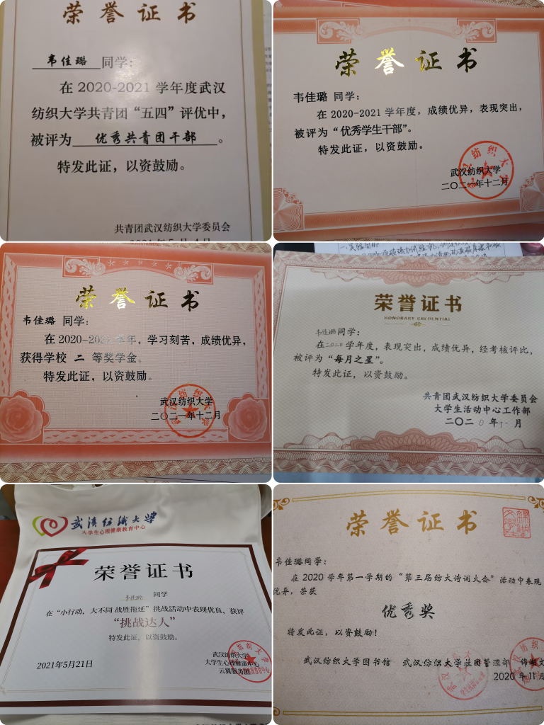 她担任班级团支书期间,积极配合上级团委工作,负责团日活动的策划,从方案的设计到活动的实施,再到后期进行活动总结,她尽心尽力,用心组织每一场活动。她带领非织12002班获评校级“五四红旗团支部”和“活力团支部”。大家都看到了她的能力和付出,她于2022年度的“五四”表彰中获得“校级优秀共青团干部”荣誉称号,连续两年被评为“优秀学生干部”。在她看来,这是组织和同学对她担任团支书工作的肯定,今后会更加勤勉,用心服务好班级同学。与此同时,她主动担任锦湖文学社社长,带领社团组织并承办了校园诗词大赛、校园“三行情诗”比赛等20场独具特色的活动,到梦空间发布活动50+次,校内参与人数高达1000+次。在大学期间,她还担任新生班助,做好学弟学妹初入校园的领路人;参加第五届学生代表大会,充分发挥了民主管理的权利和义务,加入大学生活动中心工作部校级组织,工作勤恳被评为“每月之星”。