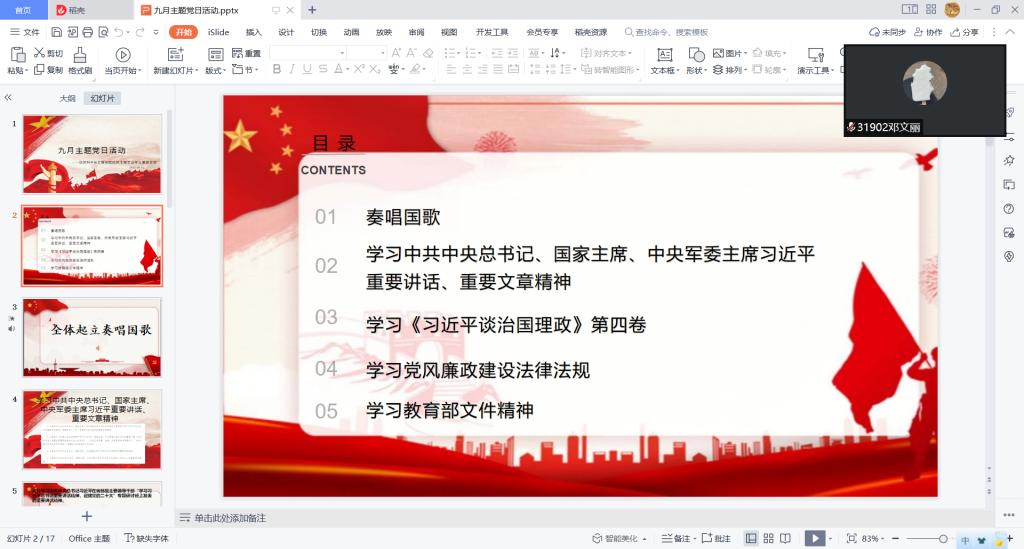 大会开始,全体起立,奏唱国歌。接着,主持人张竣青带领大家深入学习了四个专题分别是:专题一:学习习近平总书记重要讲话、重要文章精神。专题二:学习《习近平谈治国理政》第四卷。专题三:学习教育部文件精神。专题四:学习党风廉政建设法律法规。专题五:学习中央统战工作会议精神和民族宗教工作会议精神。