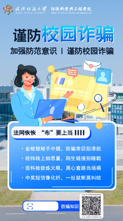 精心筹备,学生参与设计。本次活动的宣传单由学院大一本科生高小源设计制作,充分体现了龚全珍同志倡导的“自力更生、艰苦奋斗”精神。宣传内容结合当前高发的刷单诈骗、冒充客服、虚假贷款等典型案例,以纺织特色顺口溜的形式呈现诈骗手法和防范要点,生动易懂。学院学生工作负责人赵亮老师表示:“学生自主参与宣传设计,既是对龚全珍同志‘教育要面向群众’理念的践行,也能增强反诈宣传的亲和力和传播效果。”