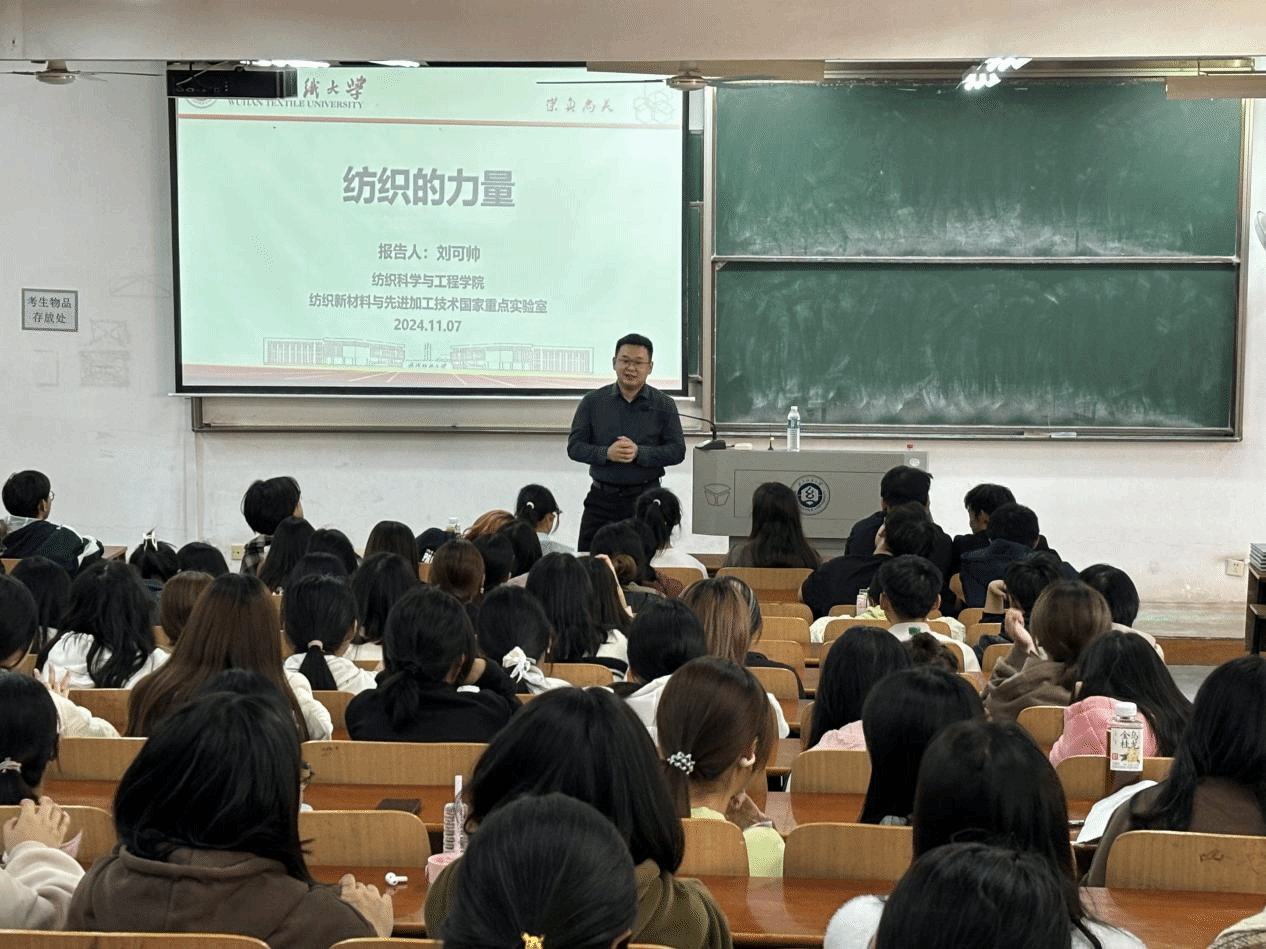 为充分利用学院高层次人才、专家教授队伍资源,发挥专业教师育人优势,探索“一站式”学生社区育人力量下沉新模式,构建师生互动交流新平台,进一步提升学生对专业认同。11月7日,纺织学院邀请中国纺织工程学会会员,湖北省楚天青年人才,武汉市黄鹤英才,湖北省纺织工程学会秘书长刘可帅老师于YG03-119为全体24级本科生开展《纺织的力量》主题讲座。