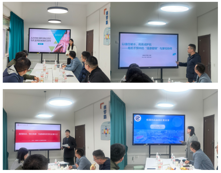 纺织学院薛萍老师以《从应急处置到事前预防:危机管理的前瞻性思考》为题,通过对典型心理危机事件的系统复盘,强调校园安全管理应树立“防患于未然”的理念,通过完善制度机制、加强日常排查、实施分类施策、深化家校协同,构建“早发现、早干预、早化解”的全流程工作闭环。微电子学院方林老师以《以信任破冰,用真诚护航——危机干预中的“信息密钥”与家校协同》为题,从心理育人和沟通策略角度出发,分享了在危机干预中如何与学生建立信任关系、走进学生内心,实现“情感介入”与“问题疏导”的有机统一。机械学院徐智航老师围绕《直面挑战、稳住阵脚:构建辅导员危机处置办法》,系统梳理了危机发生后的标准化应对流程,强调在复杂情境中保持冷静判断、依法依规处理,并提出了“情景模拟+复盘推演”的能力提升路径。经济学院马晓雪老师则以《校园危机协同处置实战录》为题,结合真实案例,深入剖析了多部门联动家校协同在危机处置中的关键作用,指出信息畅通、角色清晰、资源整合是提升协同处置效能的核心要素。