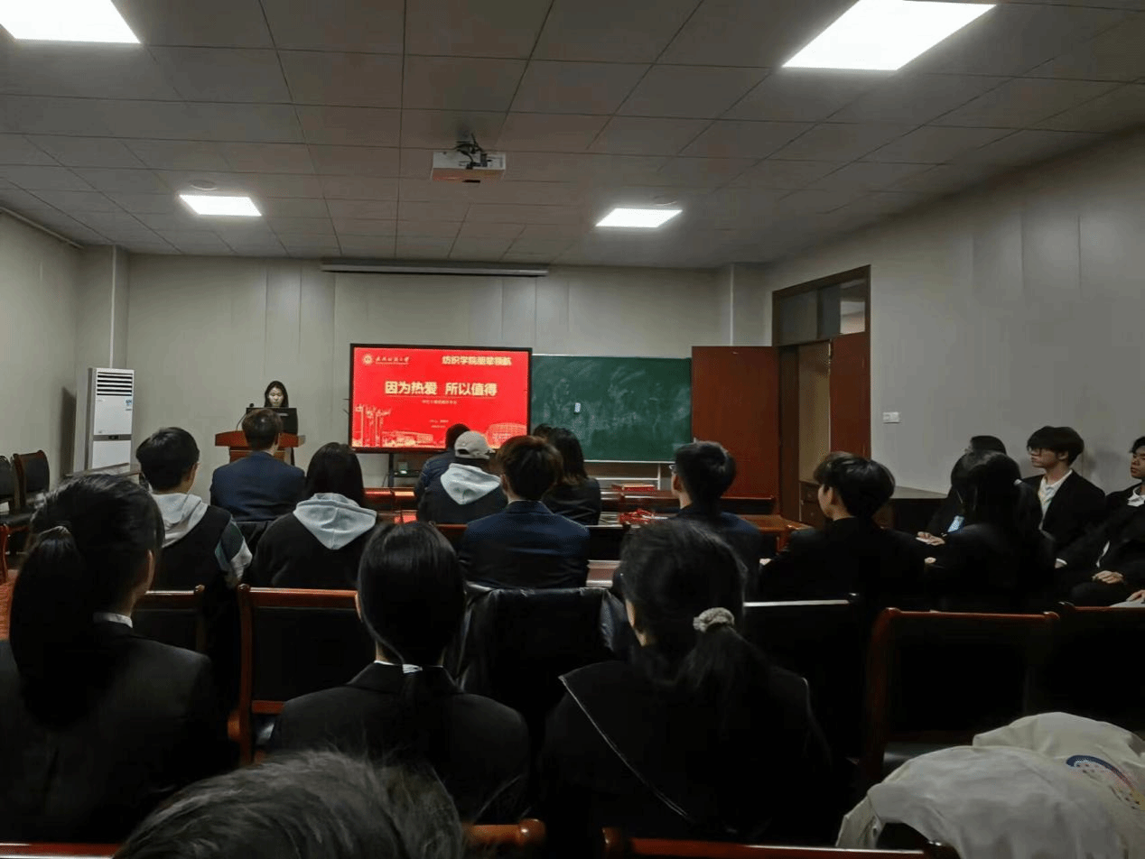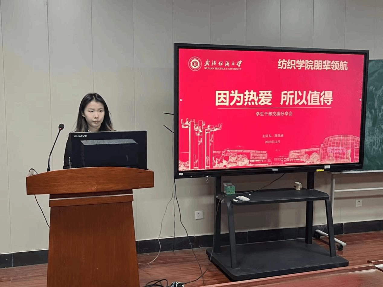于2023年11月在8H502开展了学生干部交流分享会,进行了以“朋辈领航”为主题,以“因为热爱,所以值得”为关键词的培训。“朋辈领航”是指学生干部应在担当中历练,在尽责中成长,在新时代的广阔天地中施展抱负、顽强拼搏。此次分享会有幸邀请到了学校的主席团成员周煜涵为学院的学生干部交流分享,并由纺织学院学生负责人赵亮老师、吴童玲老师和各个优秀学生代表共同参加。