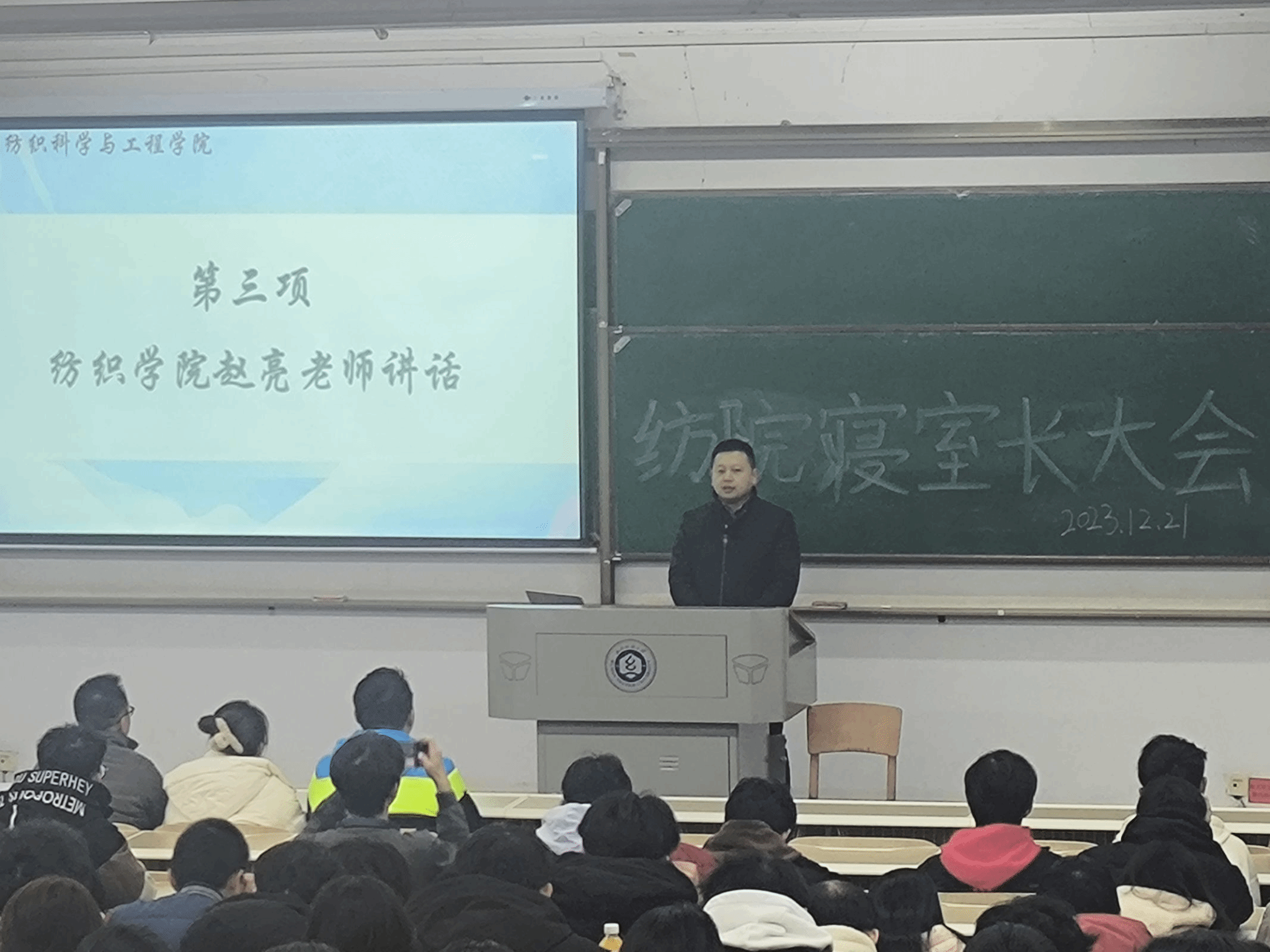为营造宿舍良好的学习生活氛围,加强安全文明寝室建设,纺织学院于12月21日晚上6点在3教T202举行2023-2024学年第二次寝室长大会。纺织学院学生工作负责人赵亮老师,学工办主任梁祥云老师,辅导员吴童玲、张竣青、向婷、余国铖老师,各年级寝室长以及宿管中心工作人员参加会议。