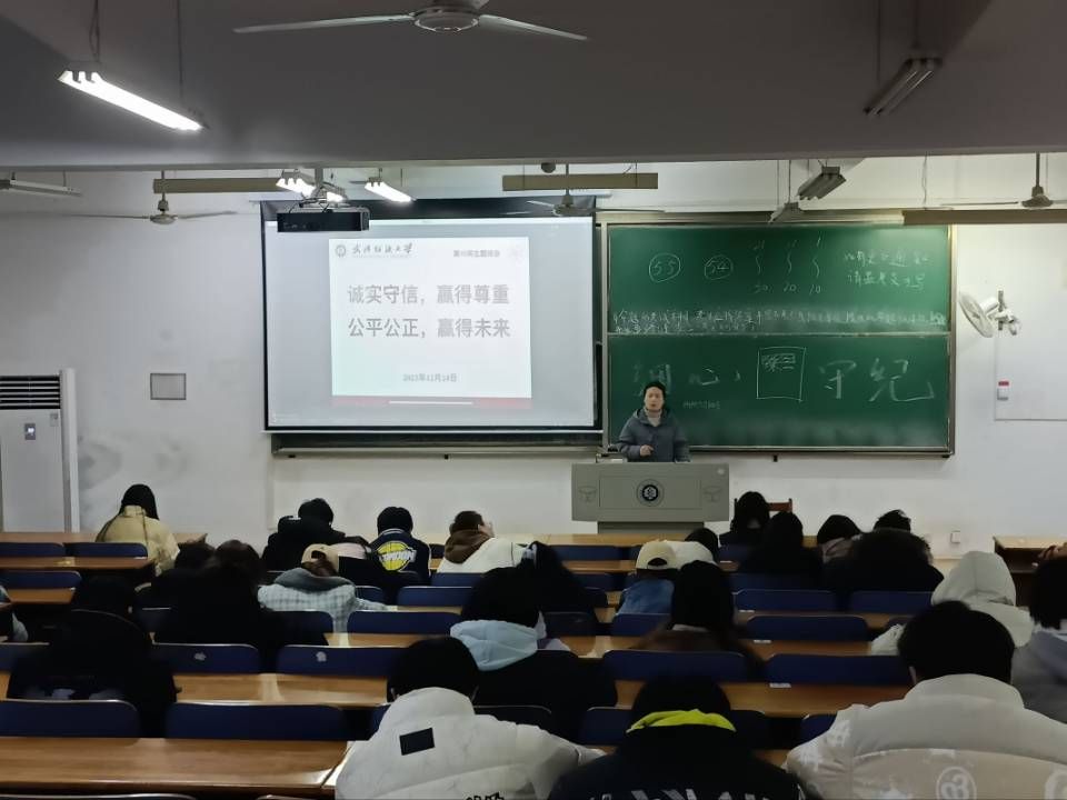 学生违纪处分实施办法》中的相关违纪处分规定,警示同学们杜绝考试作弊行为,端正考纪考风。同时,对于即将到来的期末考试,老师向大家讲解了压力的由来和表现,帮助大家正确理解压力、缓解压力,并分享了一些掌握应对考试的复习技巧和心理技巧,鼓励同学们沉稳应试。