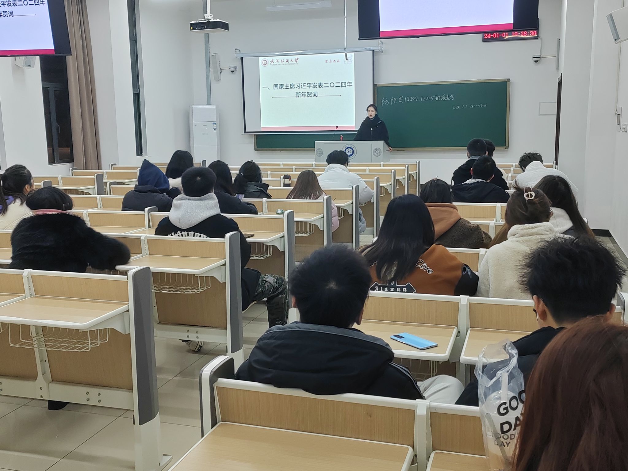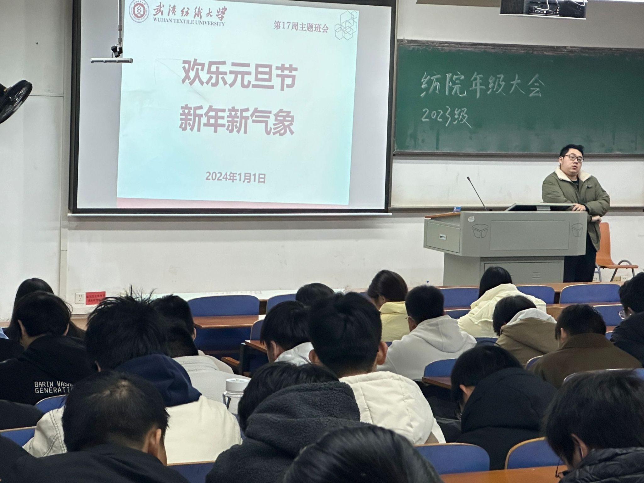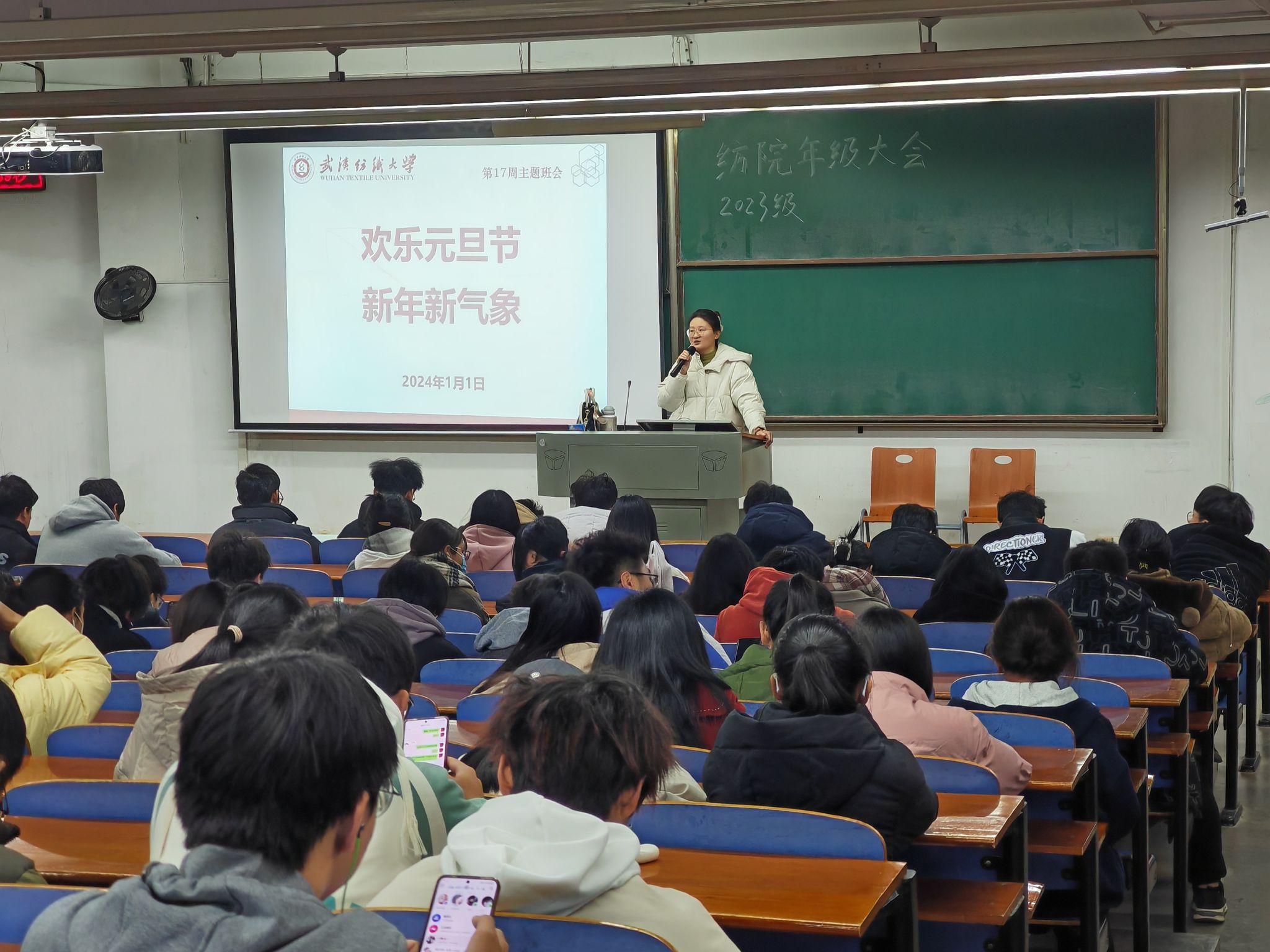 纺织学院于202411日晚举行了本学期第十七周的晚点名班会。该主题班会旨在祝福同学们在新的一年里,继续保持奋斗状态,不断努力,不断进步。展现自己的才华和精神风貌,为将自己打造成更加优秀的人才而努力。