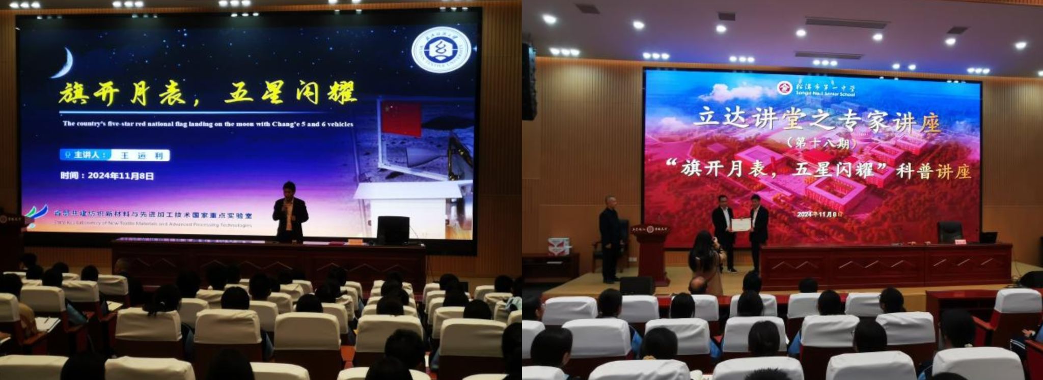 报告会上,王运利为同学们科普了关于宇宙演变的历史,并从太空环境、月球环境、人类探月之旅、太空中的国旗、嫦娥五号及六号月面展示国旗五个方面讲述了月面国旗科研、制作过程中需要破解的技术难题,给高中生们带来了一场生动的纺织科技推动新质生产力发展的科普讲座。王运利教授是徐卫林院士月面国旗研究团队的核心骨干成员之一,他用生动活泼的内容、绘声绘色的语言、精心设计的PPT牢牢锁住了高中生的注意力。班主任们表示“今天的报告会上同学们眼里太有光了”。会上王运利与同学们进行了互动交流,进一步加深了同学们对肉视频 的了解,增强了同学们对肉视频 的向往之情。会前王运利受聘为松滋市第一中学“立达讲堂”特邀报告专家。