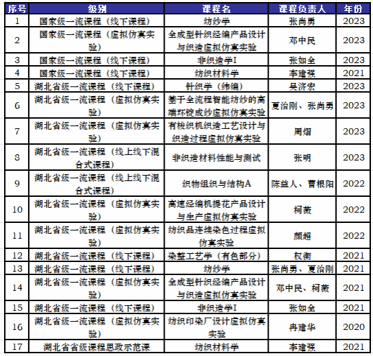近日,湖北省教育厅公布2023年省级一流本科课程名单。纺织学院4门课程获得立项。至此,学院已有省级一流本科课程9门。