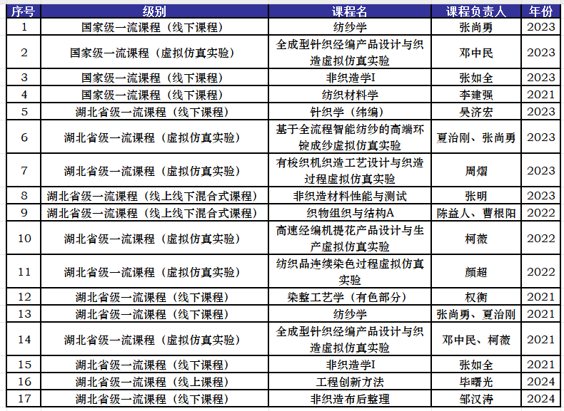 近日,湖北省教育厅公布2024年省级一流本科课程认定结果,纺织学院申报的《工程创新方法》、《非织造布后整理》两门课程成功获批立项。至此,纺织学院省级一流本科课程总数增至13门。