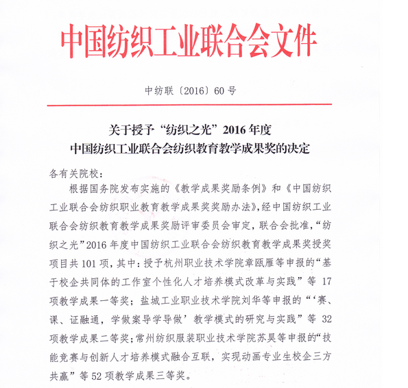 日前,为贯彻落实国务院颁发的《教学成果奖励条例》的文件精神,中国纺织工业联合会开展了纺织教育教学成果奖的评选活动。我院陈益人教授获得2016年度“纺织之光”教师奖;非织11301班李明智、纺织11404班寻丽梦等两名学生获得2016年度“纺织之光”学生奖